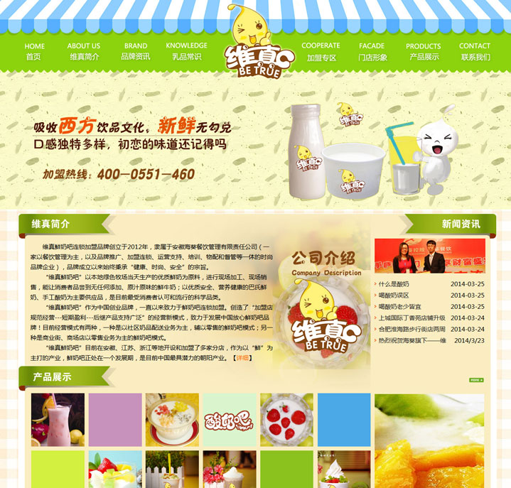 維真鮮奶吧網(wǎng)站在經(jīng)過(guò)合肥網(wǎng)絡(luò)公司技術(shù)人員的與海葵網(wǎng)站運(yùn)營(yíng)負(fù)責(zé)人的共同努力下,于2014年3月25日正式投入使用。維真鮮奶吧的網(wǎng)站主要為產(chǎn)品宣傳和招商加盟性質(zhì),網(wǎng)站頁(yè)面簡(jiǎn)潔明快,以草綠色和淡黃色為主要色調(diào)。其中維真的產(chǎn)品和店面形象以及加盟支持等使用拼盤形式,顯得輕松活潑,符合鮮奶吧的輕松時(shí)尚的旋律。