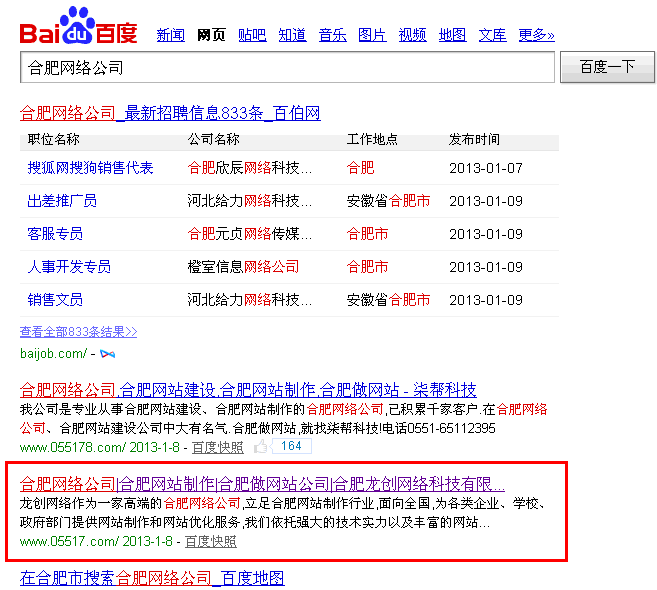 經過我公司技術人員的一致努力,目前,百度搜索“合肥網絡公司”一詞,我們的網站www.sangebeike.com.cn 已躍至百度排名第二位。以下是2013年1月8日的百度搜索截圖: